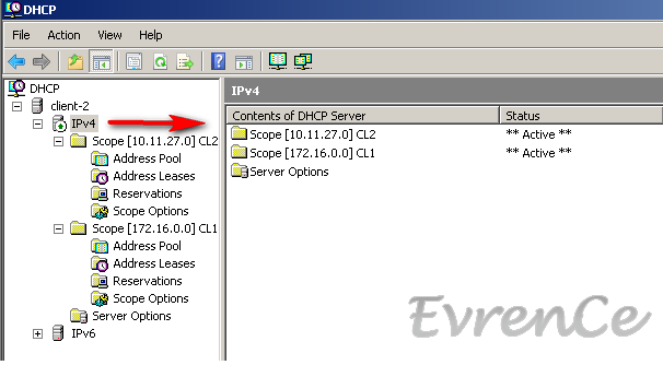 Şimdi DHCP kurulumuna geçebiliriz. Windows Server 2008 R2 DHCP Rol Kurulumunu anlatmıştım. Bu senaryoda önemli olan noktalara değineceğim sadece. Add Roles diyip DHCP yi eklediğimizi var sayalım ve Administrative Tools dan DHCP yi açalım. Burada 2 farklı skope oluşturmamız gerekiyor. İlk Scope 172.16.0.0 network’ü için IP leri dağıtacak, ikincisi ise 10.11.27.0 network’ü için.