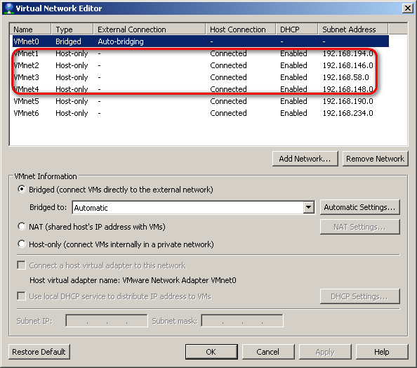 Çıkardığımız bu yapıya göre RRAS üzerinde 4 ayrı network olması gerekiyor. Bunun için öncelikle VMware / Hyper-V üzerinde bu sanal networklerimizi oluşturmalıyız. Ben VMware ‘i tercih ettiğim için yazı içerisinde VMnet leri göreceksiniz.