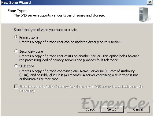 Zone eklemek için DNS Rolü kurulu olan sanal makinamızın Administrative Tools bölümünden DNS Manager konsolunu açıyoruz. Gelen pencerenin sol tarafından serverımıza sağ tıklıyor ve New Zone seçeneğini tıklıyoruz. Karşımıza 3 tane seçenek çıkıyor. Senaryomuz gereği, biz hangi tip Zone ekleyeceksek onu seçiyoruz. Örneğin Primary DNS imizi konfigure ediyorsak Primary yi seçip Next > Next diyip;