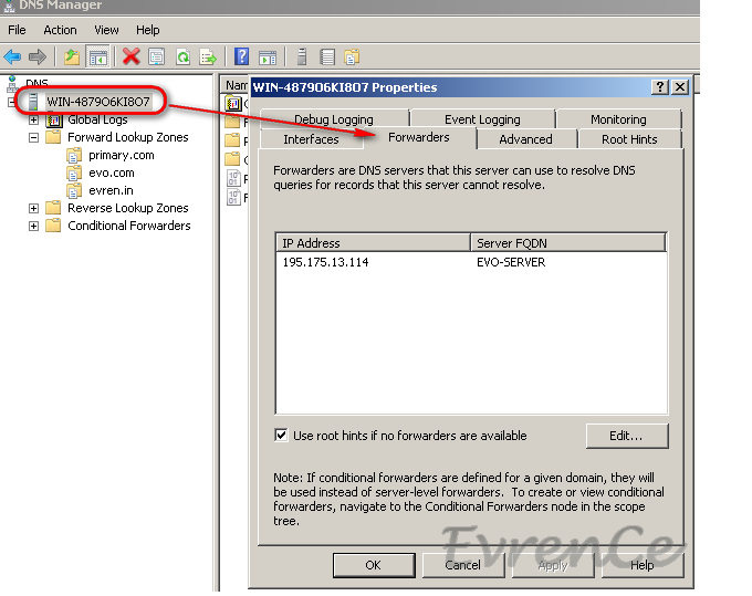 Primary ve Secondary sunucularımızın ikisinde de bu işlemi yapacağız. DNS Manage ekranındaki serverımıza sağ tıklıyor, özelliklere giriyor ve Forwarders sekmesinden edit diyip ISP DNS serverımızın IP adresini giriyoruz.